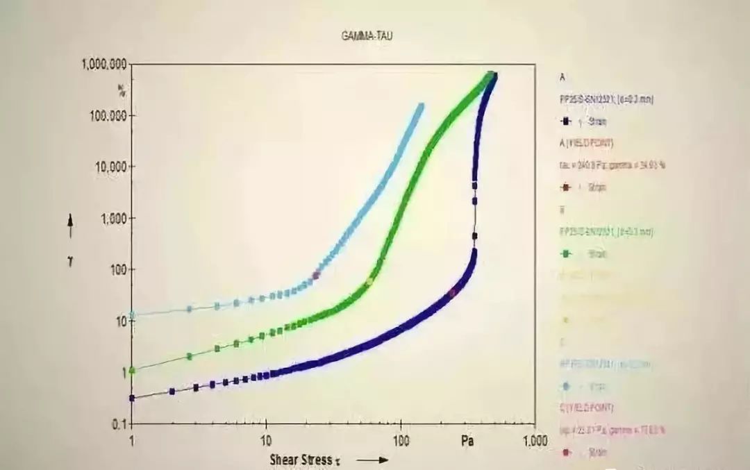 下圖是屈服應(yīng)力測試,圖的橫坐標(biāo)是剪切應(yīng)力,可以認為是施壓在樣品的力,縱坐標(biāo)是形變,在一定力的作用下,樣品的形變過程,如果說形變過程突然變大,那說明樣品已經(jīng)屈服掉了。